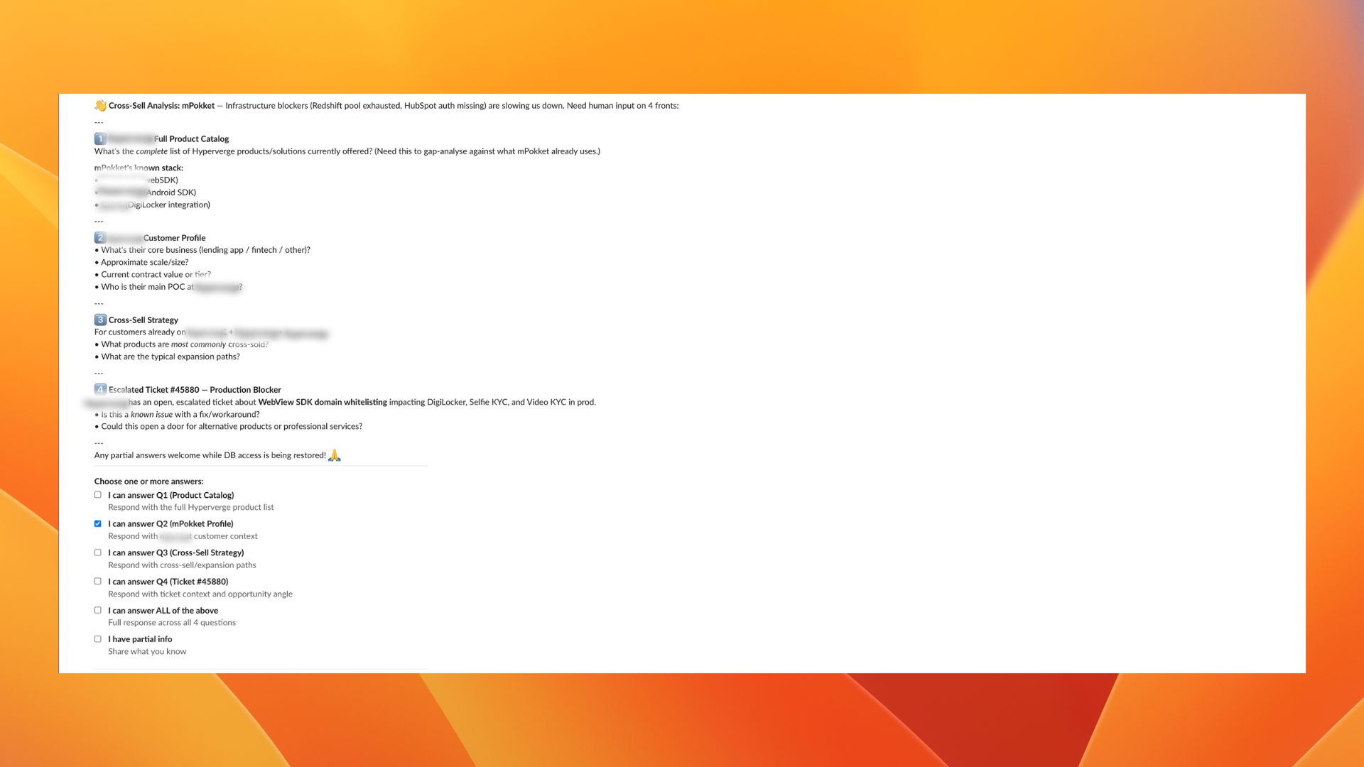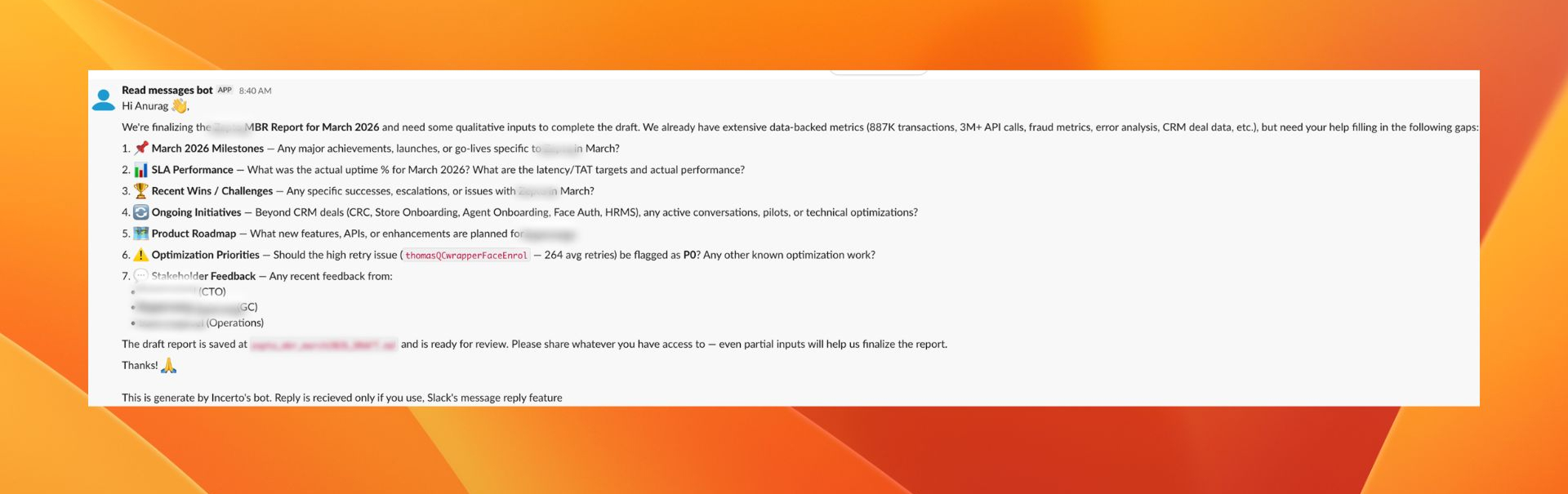 And it doesn't wait for you to notice. Incerto reaches out directly on Slack to the right person, at the right time asking only for what it can't find itself.