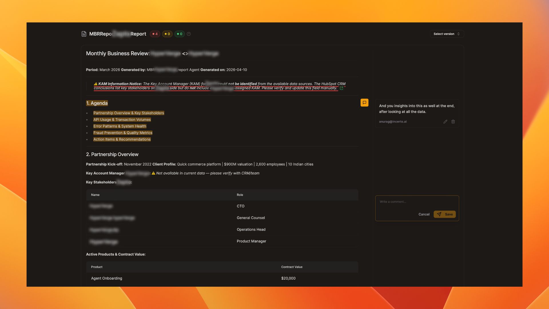Before your MBR is due, your team gets a draft. Incerto has already filled in everything it could find across your emails, CRM, Slack and support history.