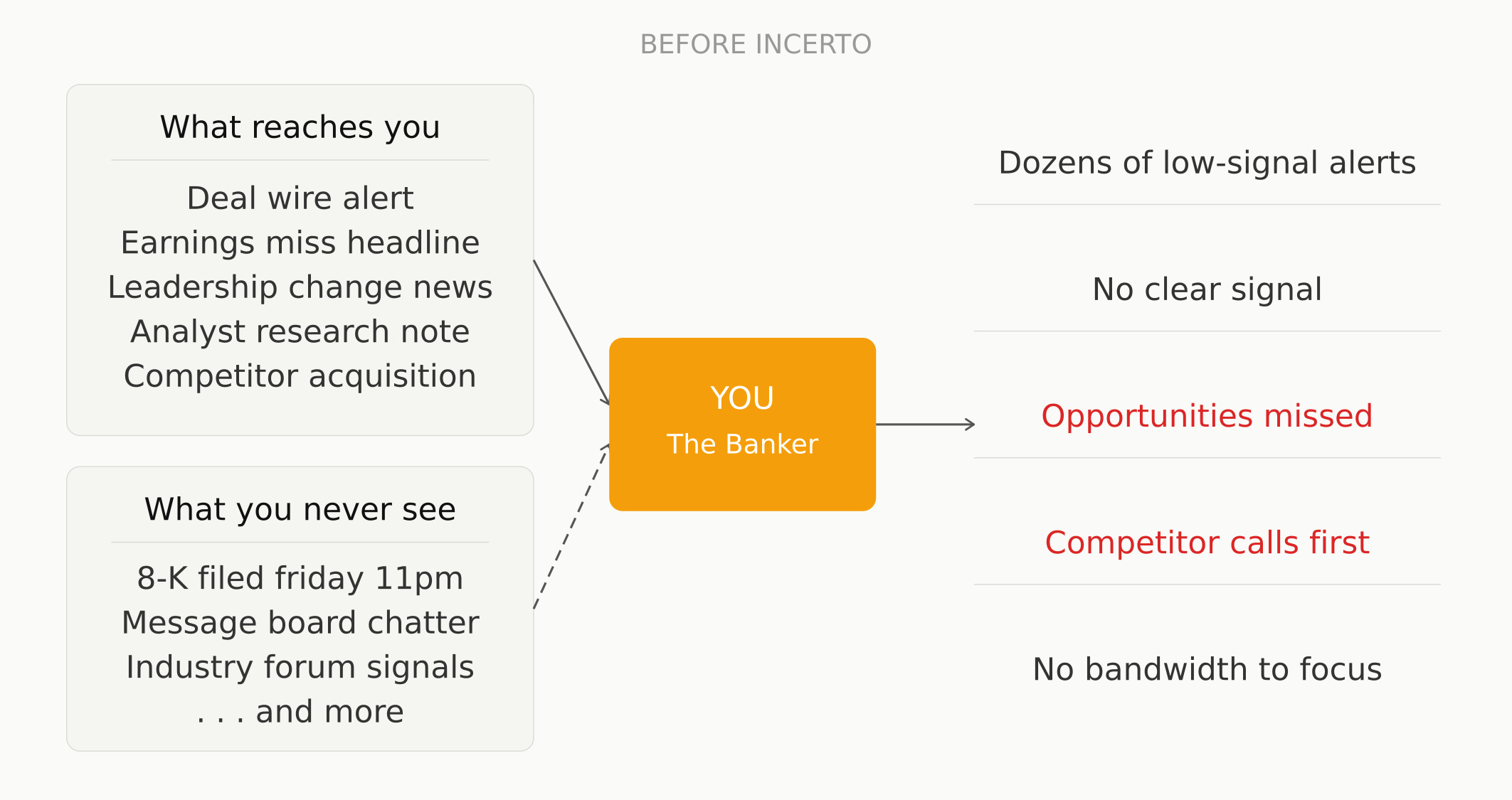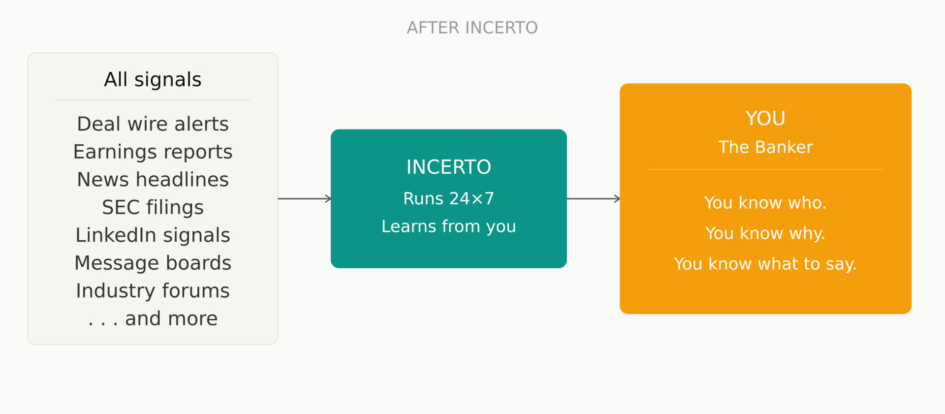 What I do know is that the banker I spoke to last week described this gap with a frustration that didn't feel like an edge case. Two MDs. Different firms. Same answer. I think something is missing and Incerto is going to build for it.